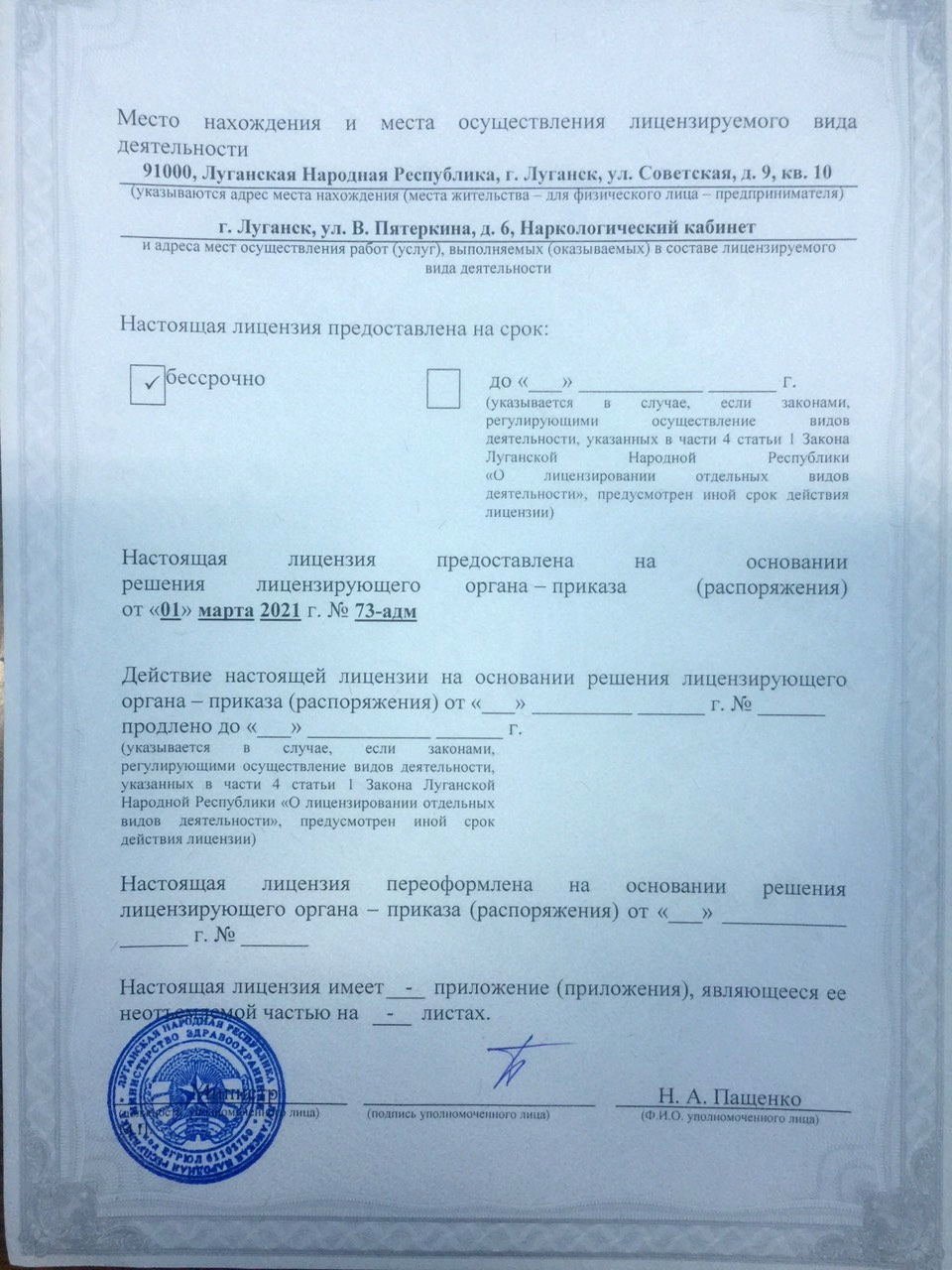 Лицензия Наркологического кабинета